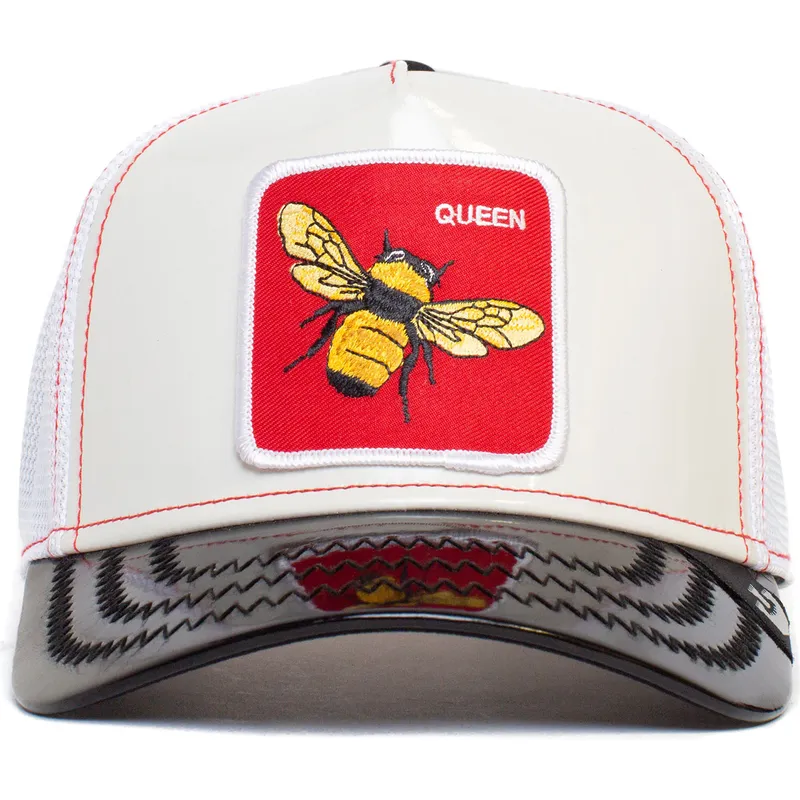Το καπέλο Goorin Bros. The Red Queen Patent Leather The Farm Bee White and Black Trucker είναι από μόνο του ένα έργο τέχνης. Το κεντημένο έμβλημα με τη μέλισσα είναι το κεντρικό σημείο του καπέλου. Η μέλισσα είναι ένα ζώο που αντιπροσωπεύει τη δύναμη και την ομαδική εργασία. Επιπλέον, το έμβλημα είναι κατασκευασμένο με μια τεχνική κεντήματος που του δίνει ένα κομψό και ανθεκτικό φινίρισμα.
